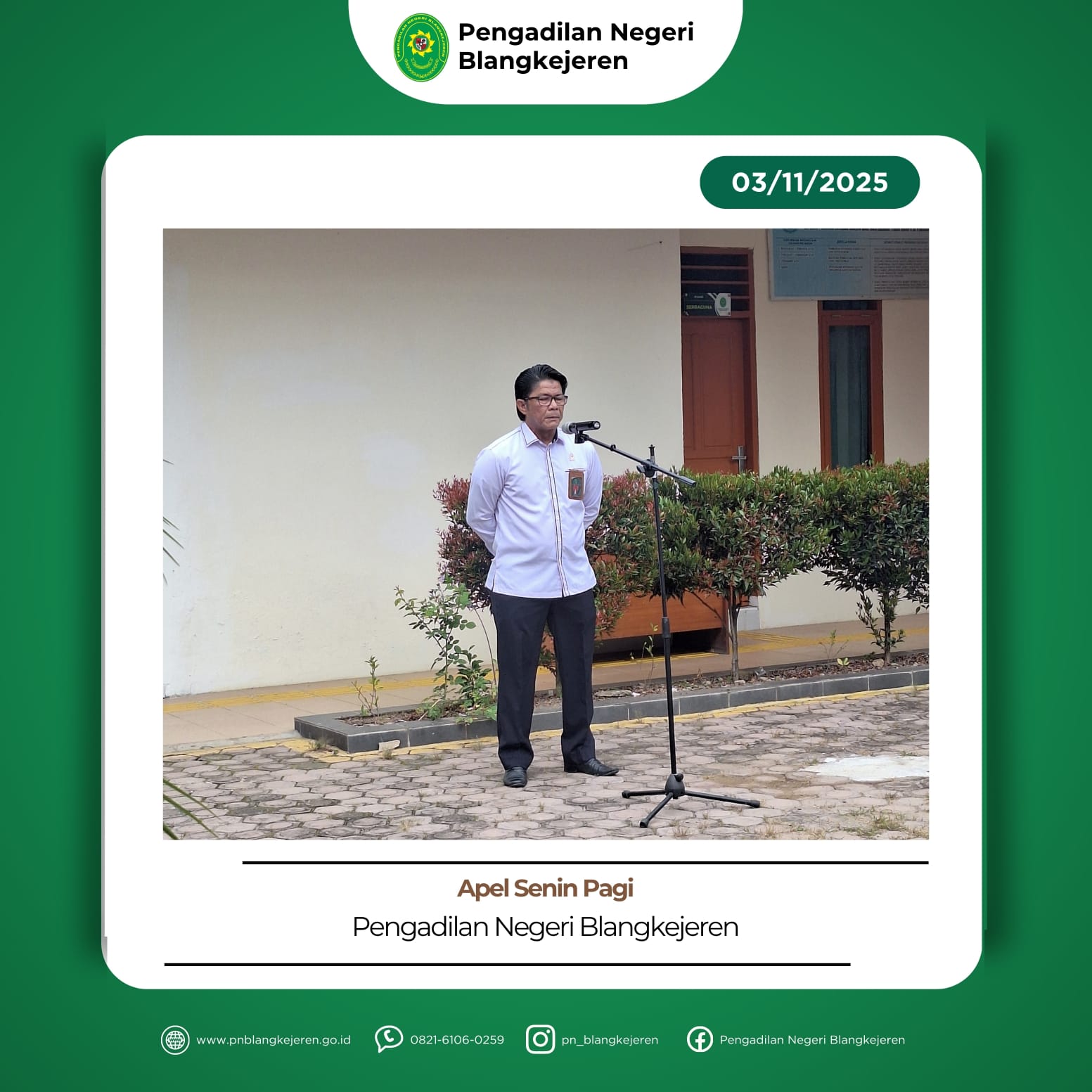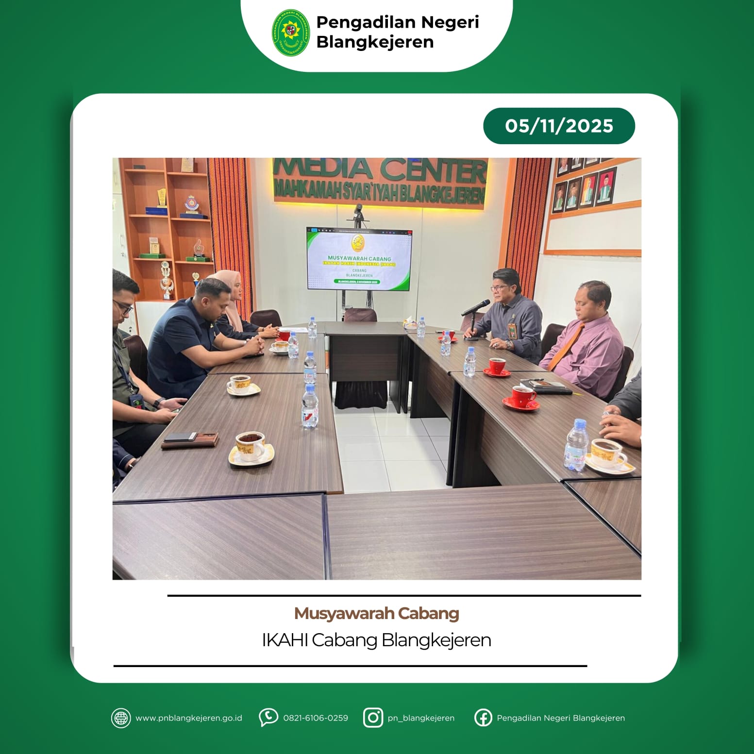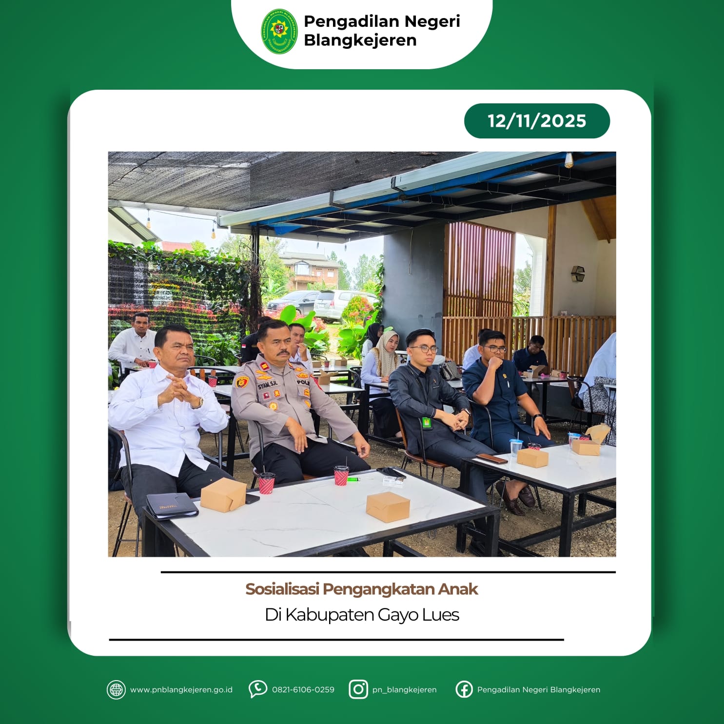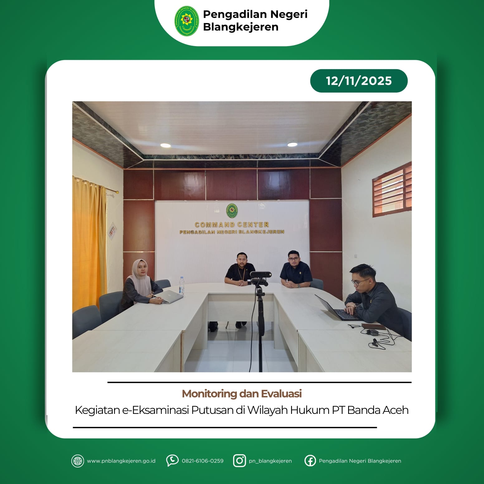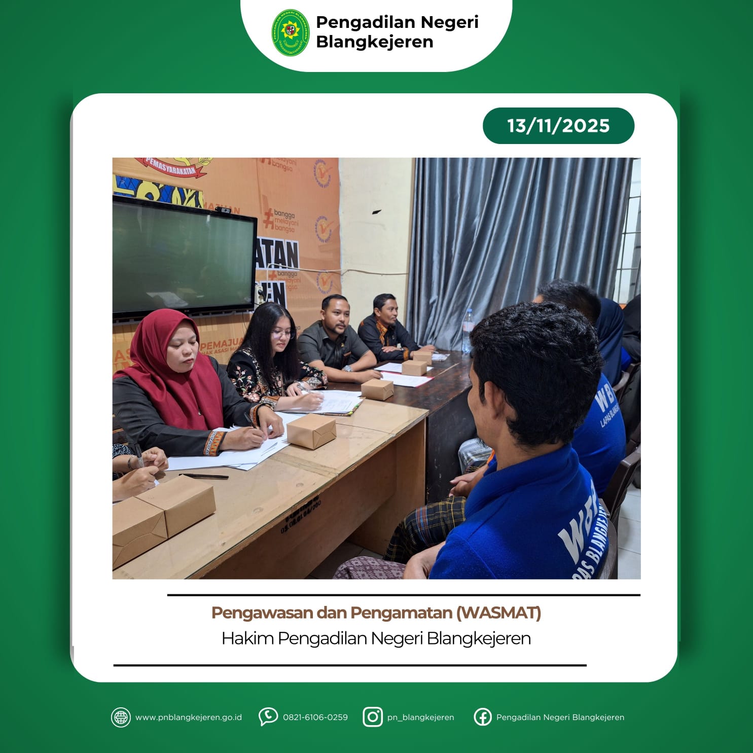 Blangkejeren – Kamis, 13 November 2025. Hakim Pengawas dan Pengamat (Wasmat) Bapak Dipo Septiawan, S.H.,M.H. didampingi Panitera dan Staf melakukan kegiatan Pengawasan dan Pengamatan di Lapas IIB Blangkejeren. Hakim WASMAT melakukan Pengawasan dan Pengamatan dengan cara melakukan wawancara dan observasi terhadap narapidana Lapas IIB Blangkejeren. Kegiatan WASMAT bertujuan untuk menjamin putusan pidana Pengadilan Negeri Blangkejeren […]