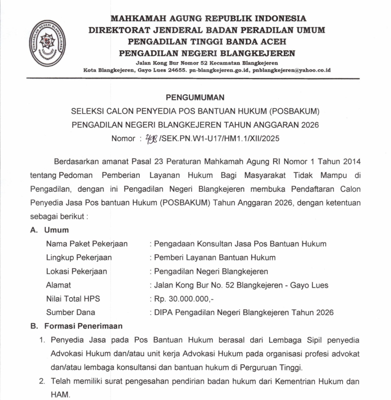 Pengumuman Seleksi calon Lembaga Pemberi Layanan Pos Bantuan Hukum (Posbakum) pada Pengadilan Negeri Blangkejeren Tahun Anggaran 2026. Informasi lebih lanjut dapat diunduh dokumen dibawah ini: