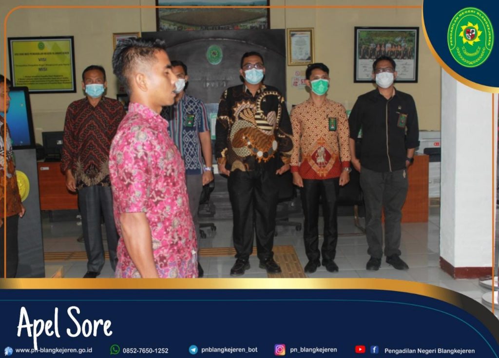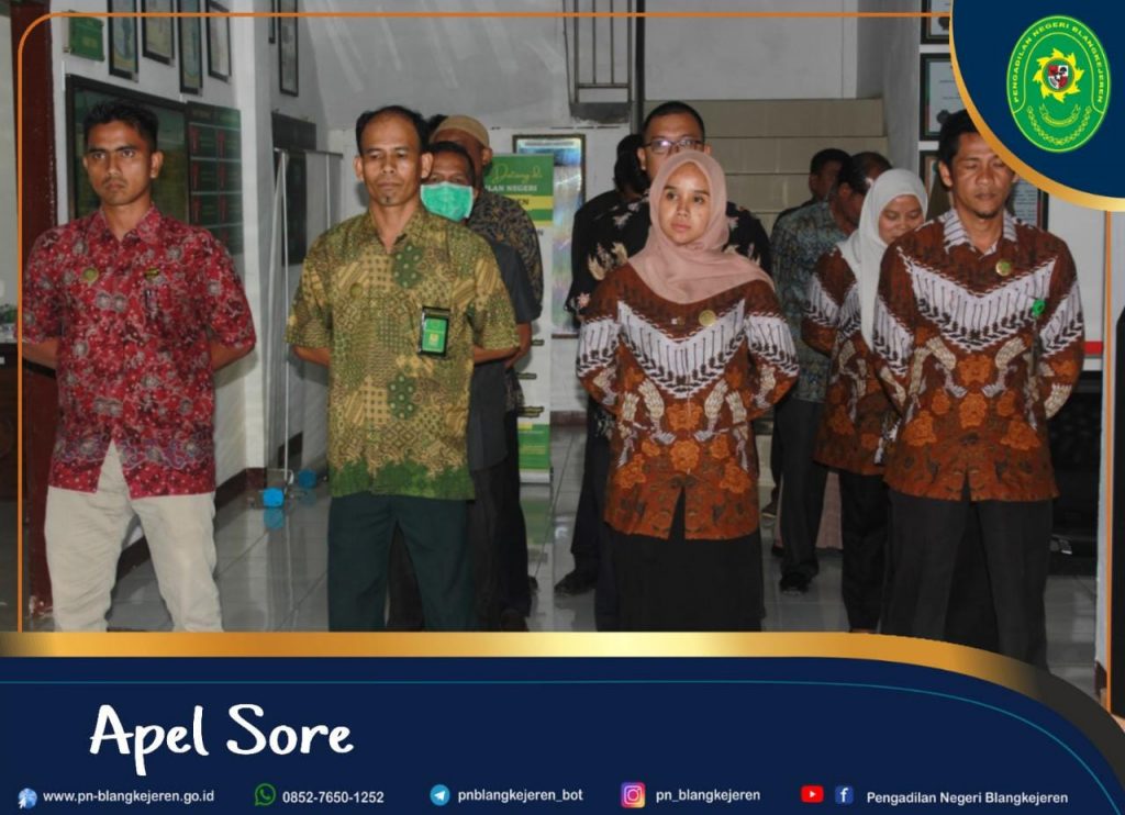 Blangkejeren- Jum’at, 25 Februari 2022 pukul 16:30 WIB bertempat di Lobi untuk melakukan kegiatan Apel Sore Rutin setiap minggunya di Pengadilan Negeri Blangkejeren telah dilaksanakan, Pembina Apel Ketua Pengadilan Negeri Blangkejeren Bapak Robby Alamsya, S.H., M.H. yang dipimpin langsung oleh Bapak Fhandy dan dihadiri oleh Para Hakim, Panitera, Panmud, Kasubbag, Jurusita dan seluruh PPNPN Pengadilan Negeri Blangkejeren.