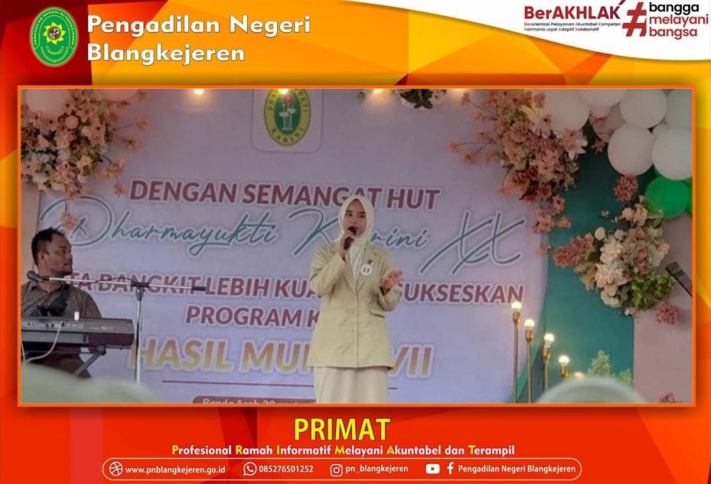 Banda Aceh-Kamis, 29 September 2022 bertempat di halaman Pengadilan Tinggi Banda Aceh, Ketua Pengadilan Negeri Blangkejeren Bapak Robby Alamsyah, S.H., M.H. sebagai Pelindung I Dharmayukti Karini cabang Blangkejeren menghadiri acara HUT Dharmayukti Karini Ke-XX beserta anggota Dharmayukti Karini lainnya. Acara ini diawali dengan tarian ranup lampuan, salah satu tarian nasional yang berasal dari daerah Aceh, dilanjutkan dengan menyanyikan lagu Indonesia Raya, lagu Dharmayukti Karini dan Mars, serta pembacaan Do’a. Dharmayukti Karini Ke-XX mengangkat tema “Kita Bangkit Kuat Mensukseskan Program Kerja Hasil Munas VII” acara ini berlangsung secara meriah.