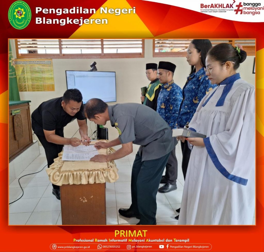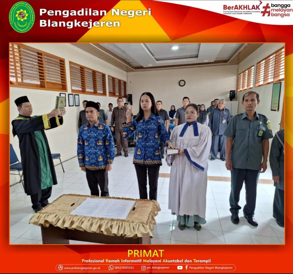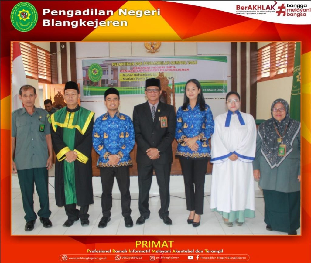 Blangkejeren-Selasa, 28 Maret 2023 pukul 08.00 WIB bertempat di Ruang Sidang Utama Pengadilan Negeri Blangkejeren telah dilaksanakan Pelantikan dan Pengampilan Sumpah Bapak Muhar Rafsanjani, Lc dan Ibu Mutiara Kania Panggabean, S.H. sebagai PNS di PN Blangkejeren oleh Yang Mulia Wakil Ketua Pengadilan Negeri Blangkejeren Bapak Bob Rosman Acara ini turut dihadiri oleh Para Hakim, Panitera, Sekretaris, Panitera Muda, Panitera Pengganti, Jurusita, Para Saksi, dan Rohaniawan.