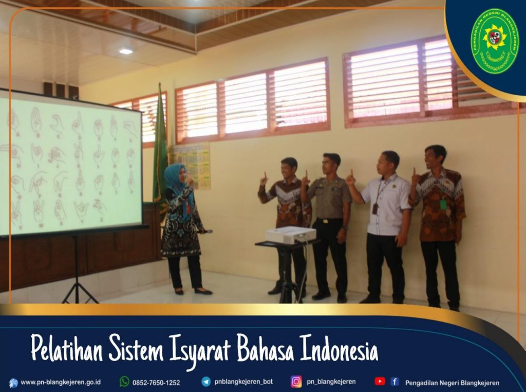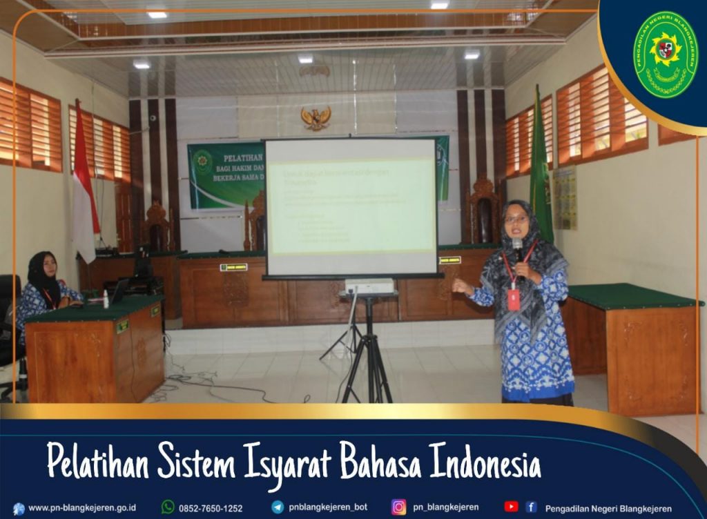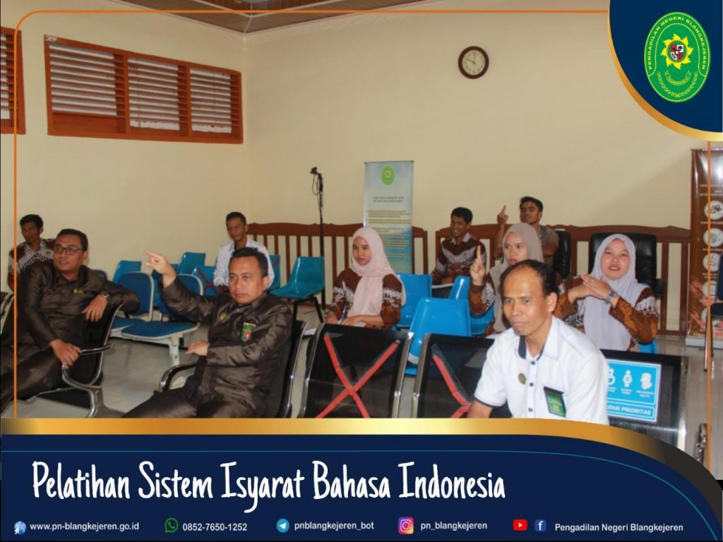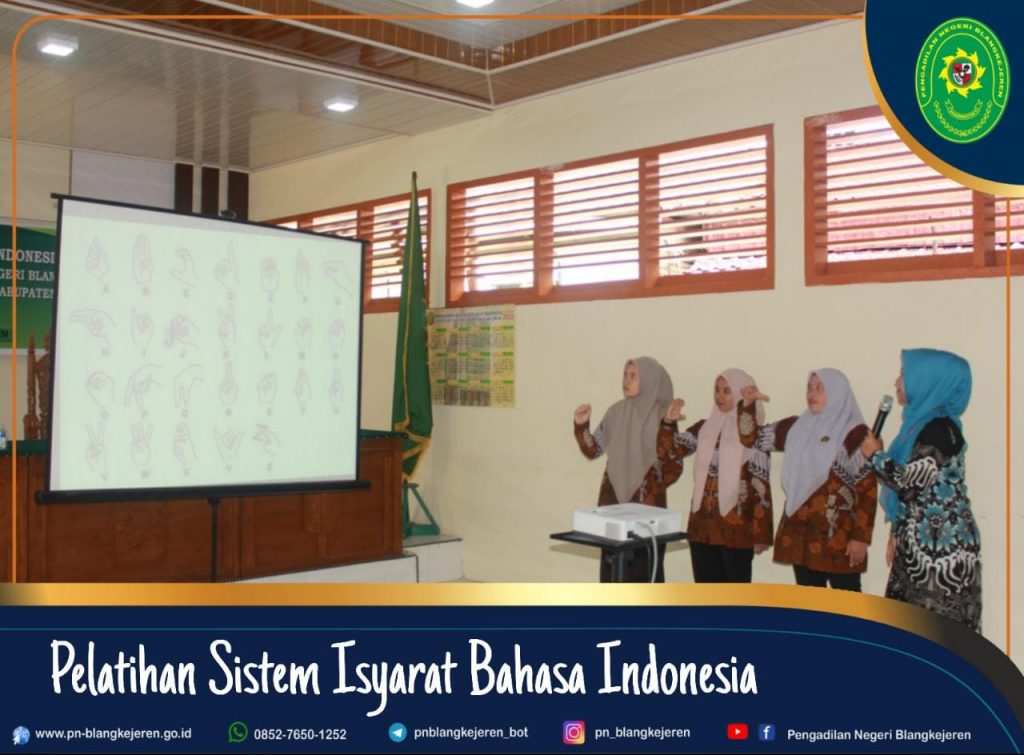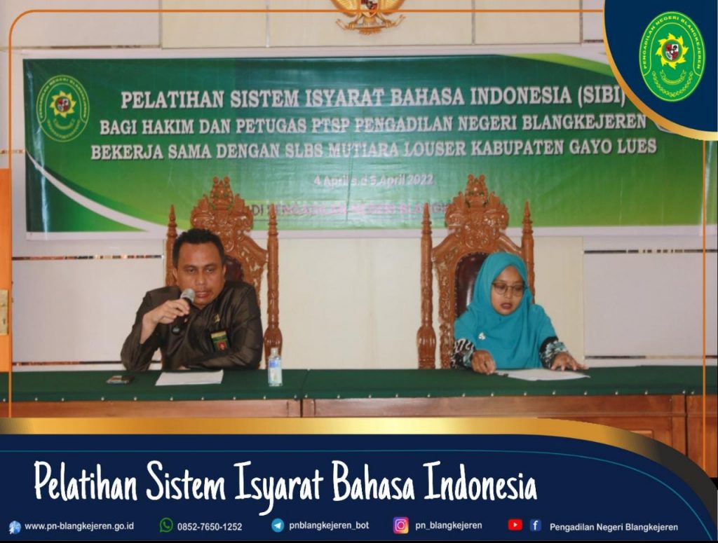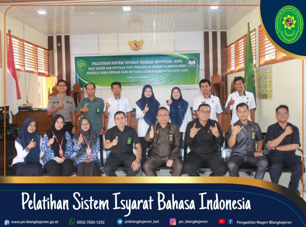 Adapun yang menjadi Narasumber dalam Pelatihan Sistem Isyarat Bahasa Indonesia (SIBI) yaitu Ibu Susteriani, S.Pd Gr, dan Ibu Ria Safrina, S.Pd serta dihadiri oleh Ketua Pengadilan Negeri Blangkejeren Bapak Robby Alamsyah, S.H., M.H, Para Hakim, Sekretaris, Panmud, Para Kasubbag, Para Pegawai dan Para PPNPN.