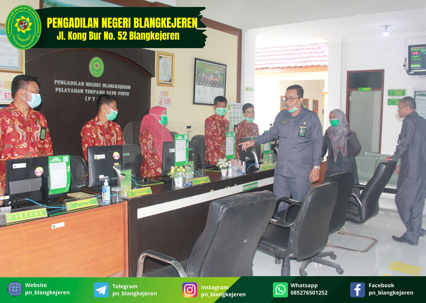 Blangkejeren, Senin 07 Juni 2021 diadakan pembinaan dan pengawasan setiap hari senin pagi terhadap petugas Pelayanan Terpadu Satu Pintu (PTSP) Pengadilan Negeri Blangkejeren. Kegiatan pembinaan dan pengawasan ini berguna untuk menguji mulai kesiapan petugas pelayanan sampai sarana dan prasarana yang menunjang. Hal ini tentunya berdampak positif dan sangat baik guna mengukur Pelayanan dari Pengadilan Negeri Blangkejeren dalam memberikan pelayanan yang prima bagi para pencari keadilan.
