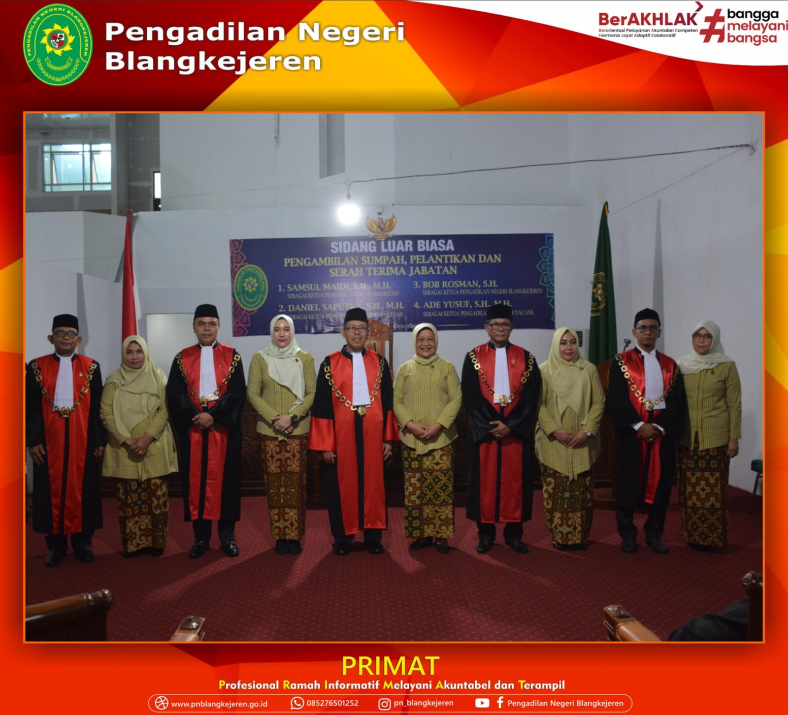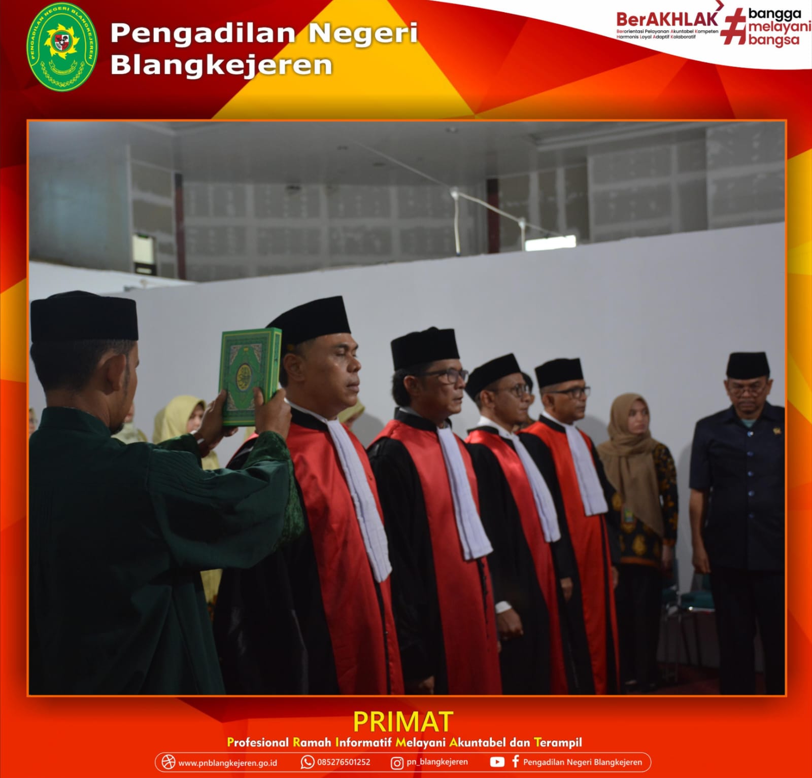 Banda Aceh-Jum’at, 01 Desember 2023 bertempat di Gedung Sementara Pengadilan Tinggi Banda Aceh, dilansungkan Sidang Luar Biasa dalam Acara Pengambilan Sumpah dan Pelantikan Bapak Bob Rosman, S.H. sebagai Ketua Pengadilan Negeri Blangkejeren oleh Ketua Pengadilan Tinggi Banda Aceh Bapak Dr. H. Suharjono, S.H., M.Hum. berdasarkan Surat Keputusan Ketua Mahakamah Agung RI Nomor : 1789/DJU/SK.KP4.1.3/X/2023 tanggal 24 Oktober 2023.